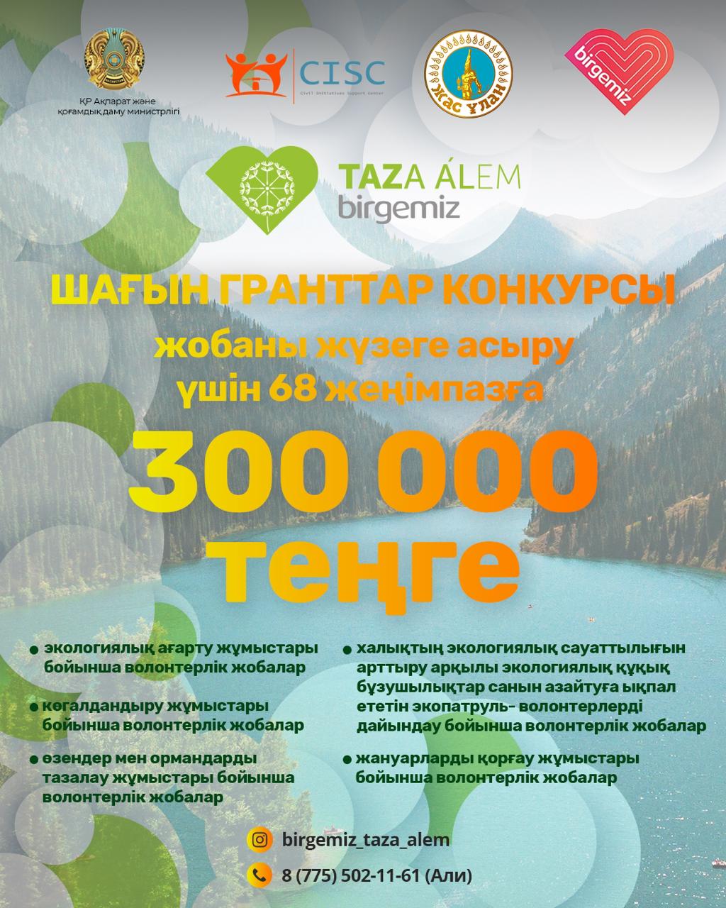 Волонтёр жылы аясында «Birgemiz:Taza Alem» жалпыұлттық жобасы келесі бағыттар бойынша шағын гранттар байқауын жариялады:
